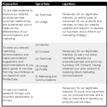We may also analyze your Identity, Contact, Technical, Usage and Profile Data to form a view which products, services and offers may be of interest to you so that we can then send you relevant marketing communications.